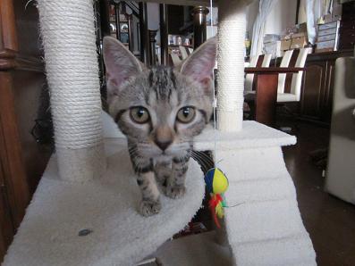 さておき、さっそくそのねこじゃらしを分解してネコタワーにぶら下げると…
